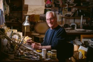 John Harned at work in his Glass Art Studio and Gallery, 2020. Photo courtesy of the Denman Christmas Craft Fair, McKinnon Photography.
